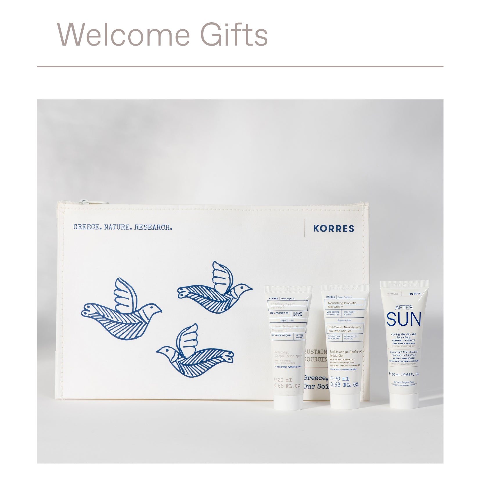 Προσφέρετε στους επισκέπτες σας το απόλυτο Welcome Gift, με προϊόντα KORRES γεμάτο αναμνήσεις από το ελληνικό αυθεντικό καλοκαίρι. Δημιουργήστε το δικό σας συνδιασμό με προιόντα Skincare, Suncare, Lipcare & Fragrance, σε retail ή travel size επιλέγοντας το αγαπημένο σας KORRES τσαντάκι.
